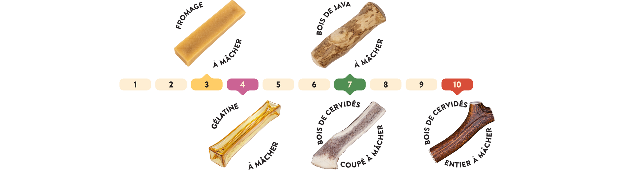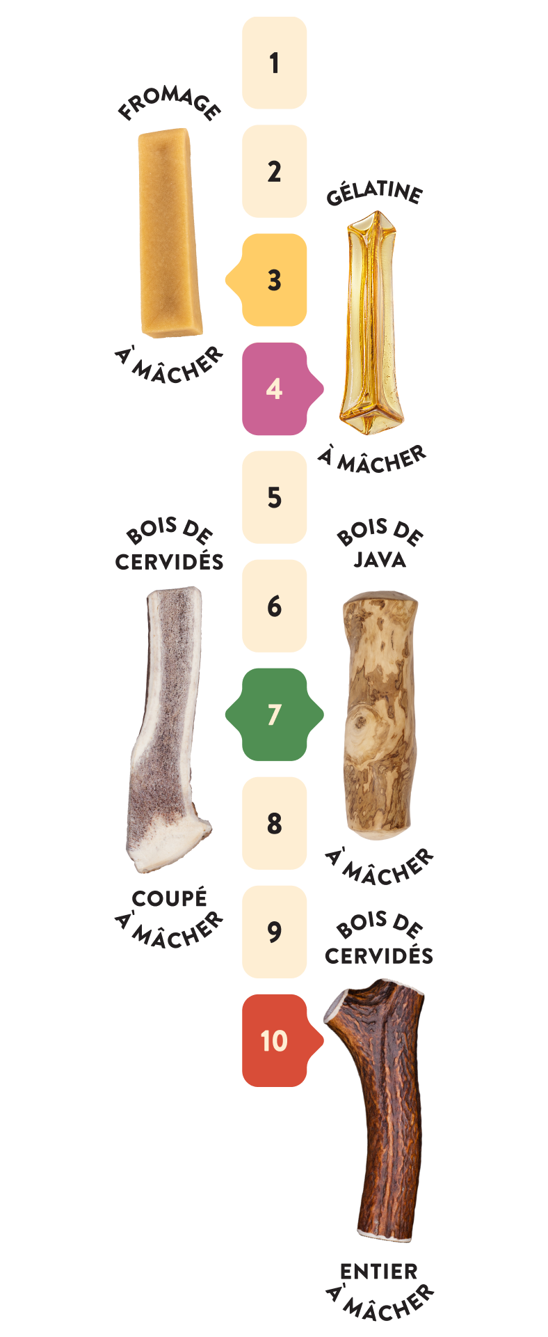 Sélectionnez le format idéal en fonction du poids, de la race et du style de mastication de votre chien.